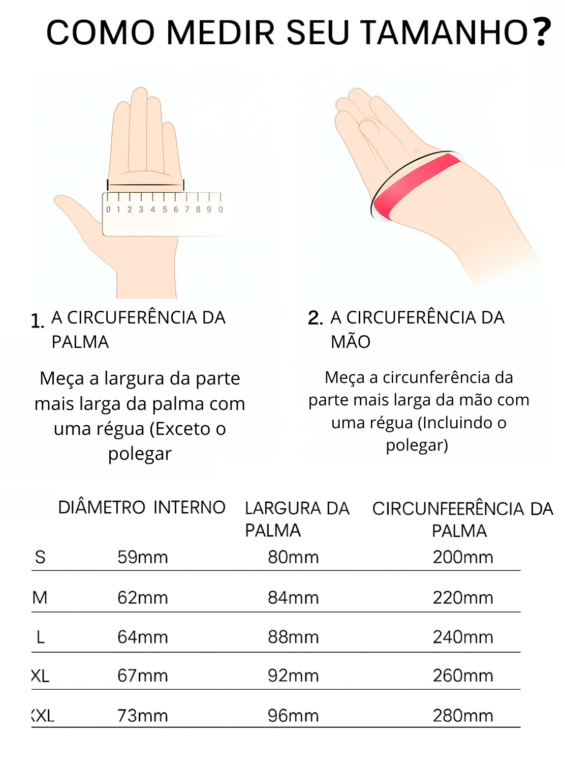 | Tamanho | Diâmetro Interno | Largura da Palma | Circunferência da Palma |