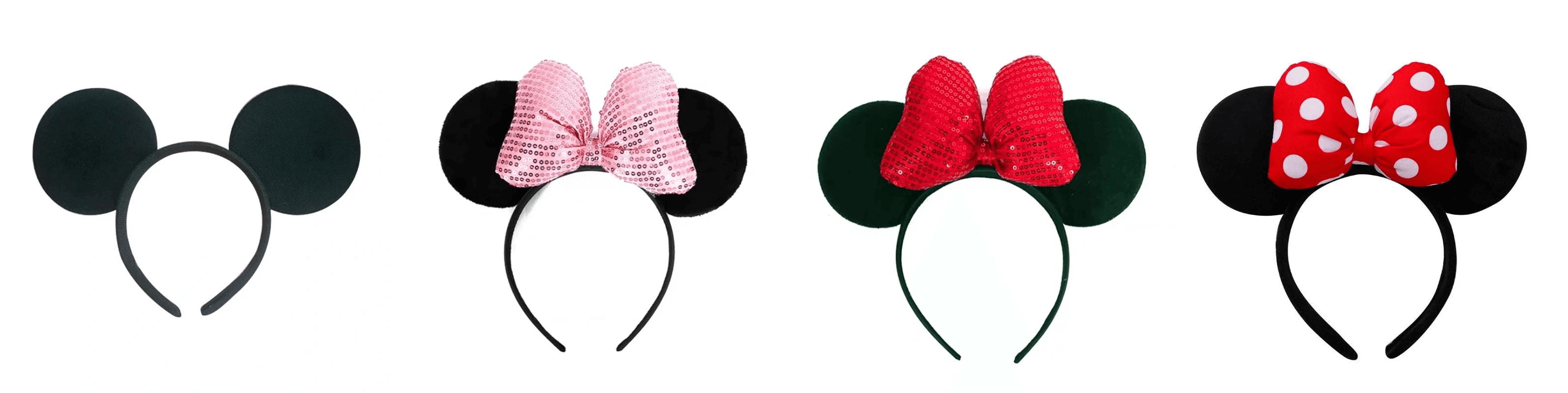 | Modelos Disponíveis | Orelhas Mickey (sem laço), Minnie com laço vermelho bolinhas, rosa com brilho, e vermelho com paetês |